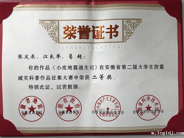 近日,安徽省地震局、安徽省教育厅、共青团安徽省委、安徽省科学技术协会联合发文公布第二届安徽省大学生防震减灾科普作品征集大赛评比结果,我校电子信息工程系数字媒体应用技术161班张发展、江良举、葛超三位同学,在唐云龙老师的指导下拍摄的科普视频《小皮地震逃生记》荣获二等奖。