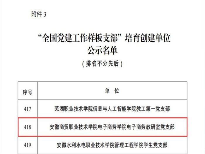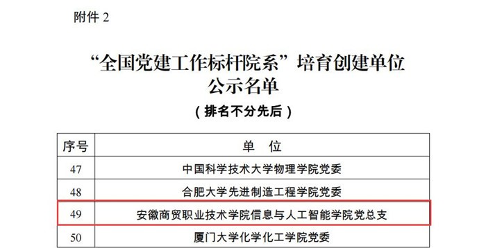 3月18日,教育部思想政治工作司对第四批新时代高校党建示范创建和质量创优工作遴选结果进行公示。我校信息与人工智能学院党总支和电子商务学院电子商务教研室党支部分别入选第四批“全国党建工作标杆院系”和“全国党建工作样板支部”培育创建单位公示名单。我校是安徽省唯一一所同时入选全国党建工作标杆院系和样板支部的高职院校。