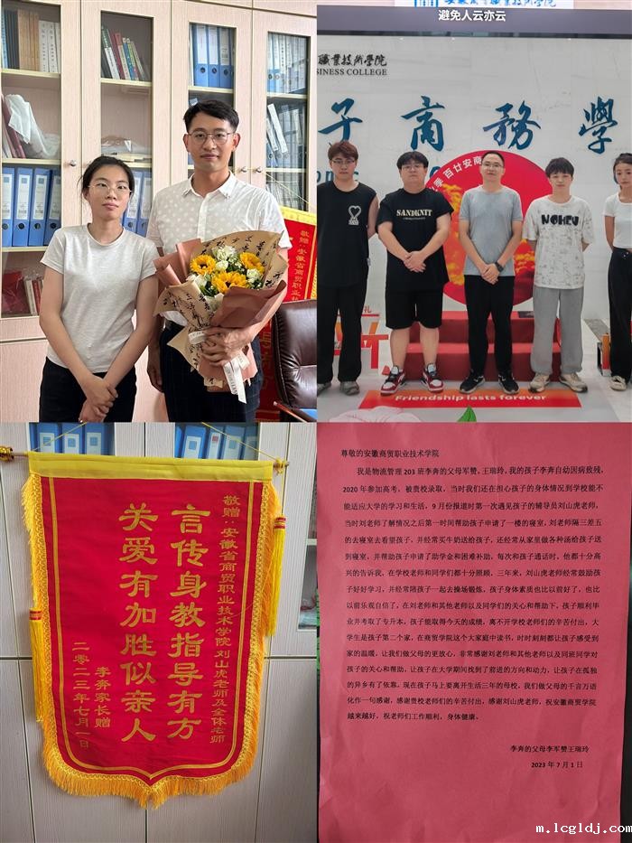 饮其流者怀其源,学其成时念吾师。学生家长代表满怀感恩之心,把绣有“言传身教指导有方、关爱有加胜似亲人”的锦旗送到了辅导员刘山虎手中,以此感谢全体老师对孩子三年的爱护与引领,感恩老师的无私奉献,并真诚祝愿学校行稳致远、再创辉煌!刘山虎感动道:“学生及家长的认可是对我们工作的最大肯定和鼓励,是荣誉,更是一份沉甸甸的责任。”锦旗虽小显真情,家校和谐育英才,教育是一场温暖的修行,亦是一场漫长的守望,以爱为基底,耐心等待花开,陪伴期待成荫。