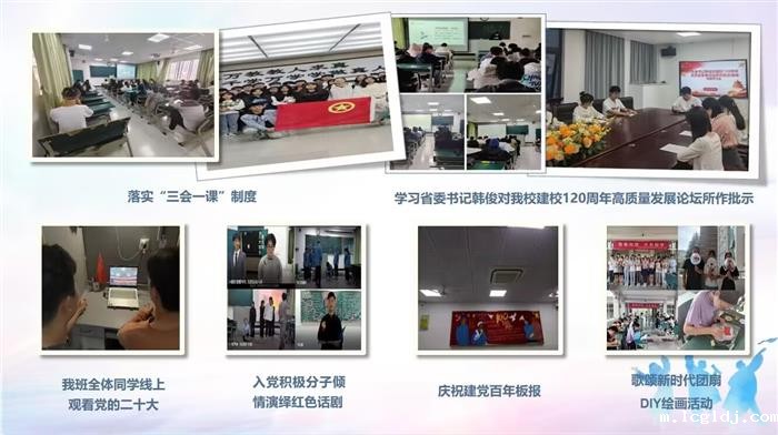 传承红色基因,赓续精神血脉。班级工作围绕支部建设,以“青年思想价值引领”为核心,落实“三会一课”制度;坚持“青年大学习”,夯实理论基础;带动班级100%递交入党申请书,增强党性修养;以“共青团工作思维”为抓手,以团日活动、知识竞赛等多种形式注入浓厚团味,引导学生关注时政、提高觉悟;充分利用“红色星期三”,学习习近平总书记重要讲话精神、集中观看党的二十大开幕会、倾情演绎红色话剧、学习省委书记韩俊对我校建校120周年高质量发展论坛的批示……通过学思践悟,增加底气、骨气、志气。