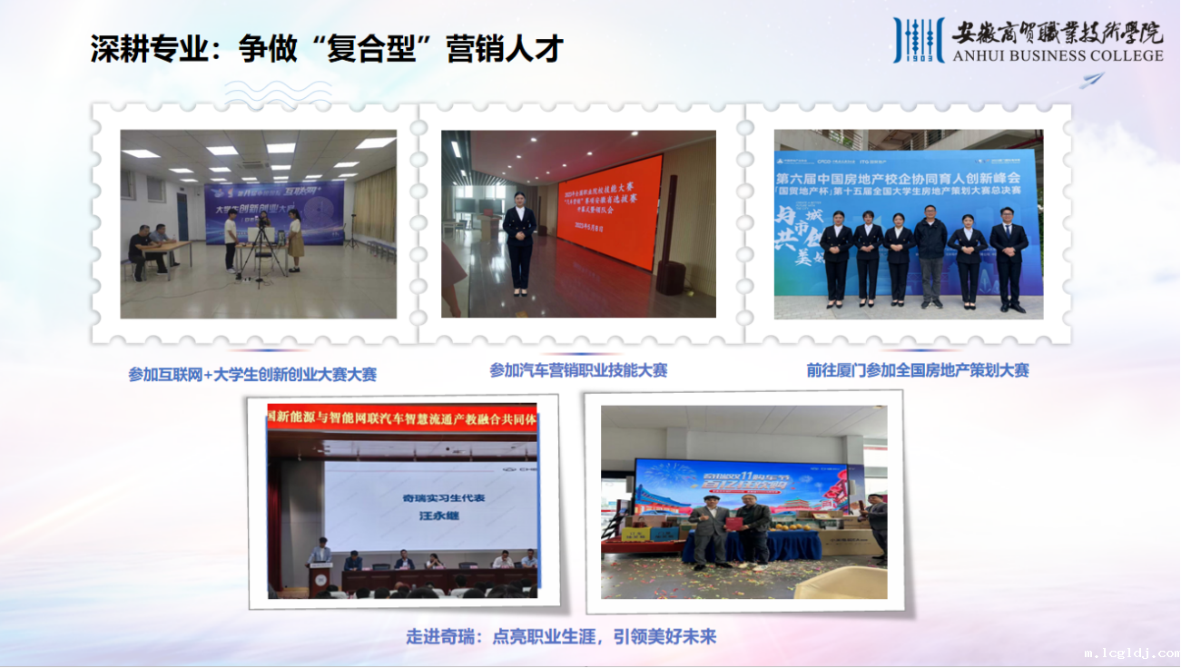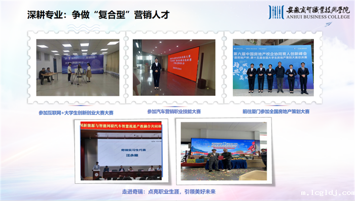 班级崇学尚学,蔚然成风。积极探索“全人发展”班级创建路径,自制的“3+X”考证制度,敦促彼此见贤思齐,强化硬实力。“功崇惟志,业广惟勤”,班级学生深耕专业,争做“复合型”营销人才,在互联网+大学生创新创业大赛、全国大学生房地产策划大赛、汽车营销技能大赛等多类赛项中斩获佳绩。为深入贯彻落实党的二十大关于深入推进职普融通、产教融合、科教融汇的精神,我校与知名企业奇瑞打造了产教融合共同体,市场营销212班学生踊跃报名参加奇瑞订单班,获得企业负责人一致赞誉;此外,班级同学积极参加三只松鼠直播岗实习工作,内容制作、直播营销能力得到极大锻炼。