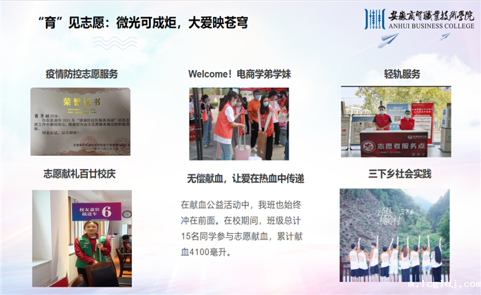班级始终秉承“微光可成炬”的信念,穿上了“志愿红”,用行动书写初心使命。在疫情防控、无偿献血、暑期“三下乡”、芜湖轻轨试乘志愿服务、迎新服务、百廿校庆期间都贡献了自己的力量,累计服务时长超300小时。作为市场营销专业学生,理应带着“营销思维”来推销自己,班级通过HR模拟体验赛、《令人心动的offer》观影活动助力未来高质量就业。值得一提的是,在现场展示中,班级创新形式,为在场所有师生献上了《市场营销212班致母校的一封信》,表达对母校热烈又真挚的情感。