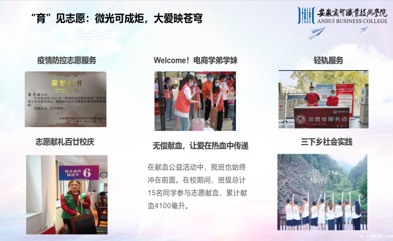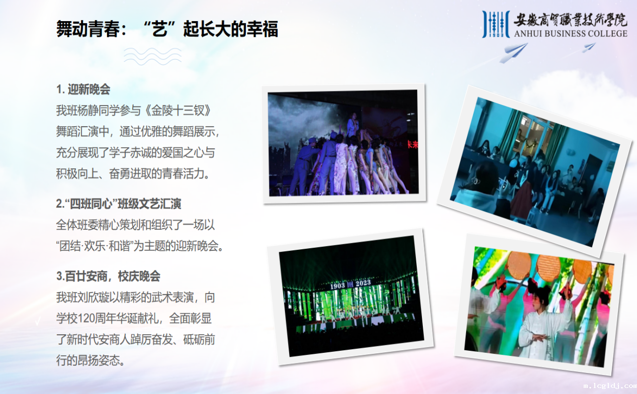 不学礼、无以立。班级举办“老师,您好”文明礼仪活动,开展趣味宣传视频——30秒文明礼仪小剧场,汉服爱好者也自发展示中华传统文明礼仪,传承尊重长辈与礼仪之道。心理健康方面,开展“心理信箱”请回答2022、向安师大专升本学姐学长请教学业成长困惑的“拜托了,学长!”、王者荣耀争霸赛等学生互助互爱系列活动。静,乃宿舍之本;雅,集宿舍之美;谐,博宿舍之爱。班级“寝”密无间、安全先行,并陆续荣获“6S寝室”“三好寝室”等优秀寝室称号。在体育运动方面,班级学生也当仁不让,在安徽省大学生运动会、院校级运动会、“商贸杯”篮球赛以及各类各级文艺汇演中彰显了新时代BETVlCTOR手机登录人赤诚的爱国之心与踔厉奋发、砥砺前行的昂扬姿态,收获了“艺”起长大的幸福。
