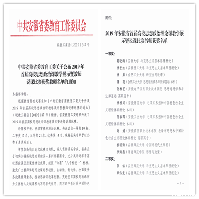 为深入贯彻落实中央、省委关于切实加强高校思想政治理论课建设一系列部署要求,充分展示近年高校思政课优质课堂建设成果,日前,由中共安徽省委教育工委主办、安徽师范大学承办的2019年安徽省首届高校思政课教学展示暨教师说课比赛在芜湖落下帷幕。经过各个学校组织推荐,全省本科、高职院校共62名教师进入到最后现场比赛,共评选出一等奖10名、二等奖17名、三等奖21名、优秀奖14名,我校思政教学部谢婧老师在众多选手中脱颖而出,荣获一等奖。