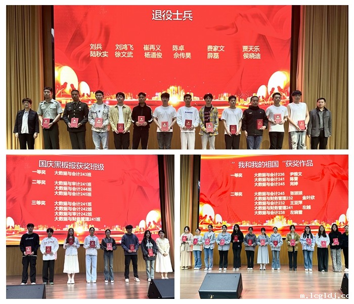 会计学院党总支书记王珠强和院长鲁学生为会计学院在校就读的退役士兵颁发荣誉证书。会计学院办公室主任程慧和团总支负责人刘诗捷为“我和我的祖国”获奖作品和国庆黑板报获奖班级颁发证书。