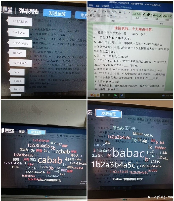为引导教育学生以实际行动喜迎党的二十大胜利召开,10月初,党支部决定以《习近平新时代中国特色社会主义思想》课程为依托,开展“喜迎党的二十大知识竞答”活动。竞答问题包括历届党代会知识要点、党代表的产生方式、结构比例以及党代会的会议议程等。屏幕上不断滚动显示的作答弹幕,折射出同学们踊跃参与竞答的热情。此次竞答活动,极大调动了同学们学习党史知识的积极性,增进了他们对即将召开的党的二十大的了解。