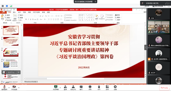 10月14日晚,马克思主义学院党支部书记杨卫宏于线上为全体支部成员讲授了一堂以“学习贯彻习近平总书记省部级主要领导干部专题研讨班重要讲话精神及《习近平谈治国理政》第四卷”为主题的党课。课上,杨卫宏系统讲解了习近平总书记系列讲话的重大意义、主要内容及核心要义;紧跟党的二十大召开的日程,为支部教师们讲解了党的二十大召开的背景、意义和任务;结合国际和国内环境,引导支部成员们深刻领会党在新时代对社会主义现代化强国的战略部署。通过学习,支部成员们加深了对《习近平谈治国理政》第四卷的整体把握和理解,增强了自身的理论素养和政治意识。