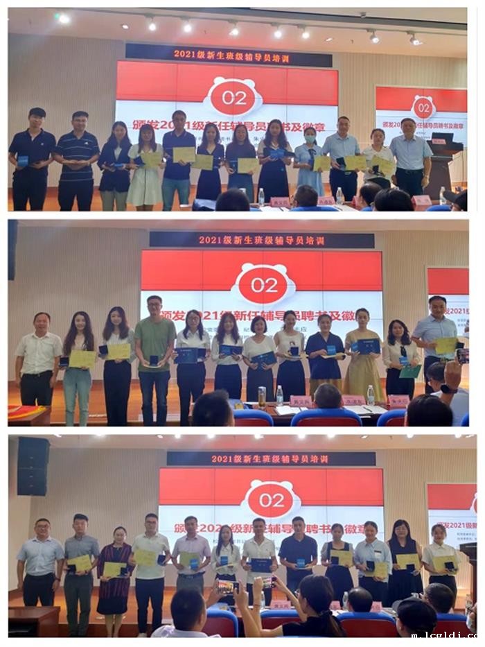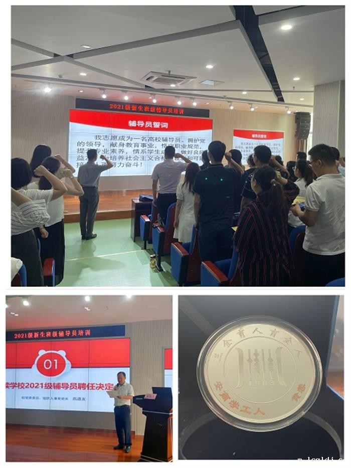 此次培训将仪式教育纳入培训各环节,通过各种仪式环节的设计让辅导员清晰工作思路,明确育人职责。培训共分为入岗仪式、专题讲座、经验交流和院本培训四个部分,内容涵盖职业使命、育人理念、日常管理制度、安全教育、心理健康教育、资助工作、团学工作、辅导员经验分享、信息化系统培训等方面。在入岗仪式上,校党委委员、组织人事处处长高道友宣读了学校2021级新生班级辅导员聘任决定,并与校党委副书记、纪委书记朱光应、教务处处长黄义兵一同为33名专兼职辅导员颁发了聘任证书和“BETVlCTOR手机登录学工人”徽章。随后,全体辅导员庄严宣誓“我志愿成为一名高校辅导员,拥护党的领导,献身教育事业……”,谆谆誓言响彻会场。
