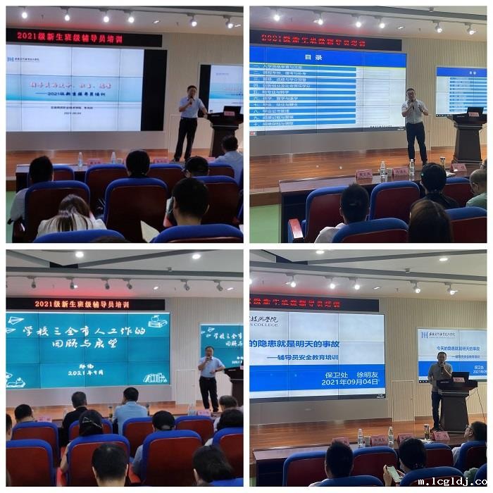 教务处处长黄义兵详细解释了学校学籍学历和成绩管理办法,要求新生班级辅导员尽快熟悉学生日常教学管理制度,严格按规章处理各项工作事务。保卫处副处长徐明友以《今天的隐患就是明天的事故》为题,从校园安全存在问题、学生安全工作关注点、学生安全问题处置和学生安全工作要求方面开展学生安全教育专题培训。郑伟以《学校三全育人工作的回顾与展望》为题,从“多贴近”“下手管”“甘担当”和“用心爱”四个方面阐释了学校“三全育人”工作的理念。