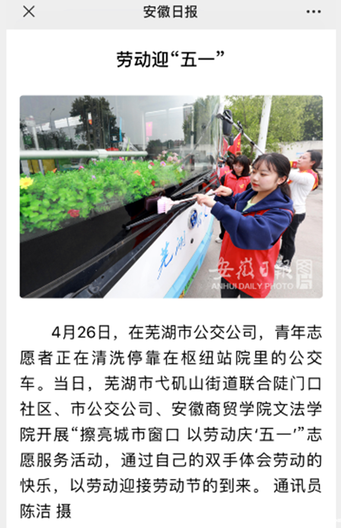 为弘扬“奉献、友爱、互助、进步 ”的志愿服务精神,增强青年学生的志愿服务意识,4月26日,在芜湖市公交公司,我院团总支联合芜湖市弋矶山街道陡门口社区、市公交公司开展“擦亮城市窗口 以劳动庆‘五一’”志愿服务活动,通过自己的双手体会劳动的快乐,以实际行动迎接劳动节的到来。安徽日报对本次活动进行了报道。
