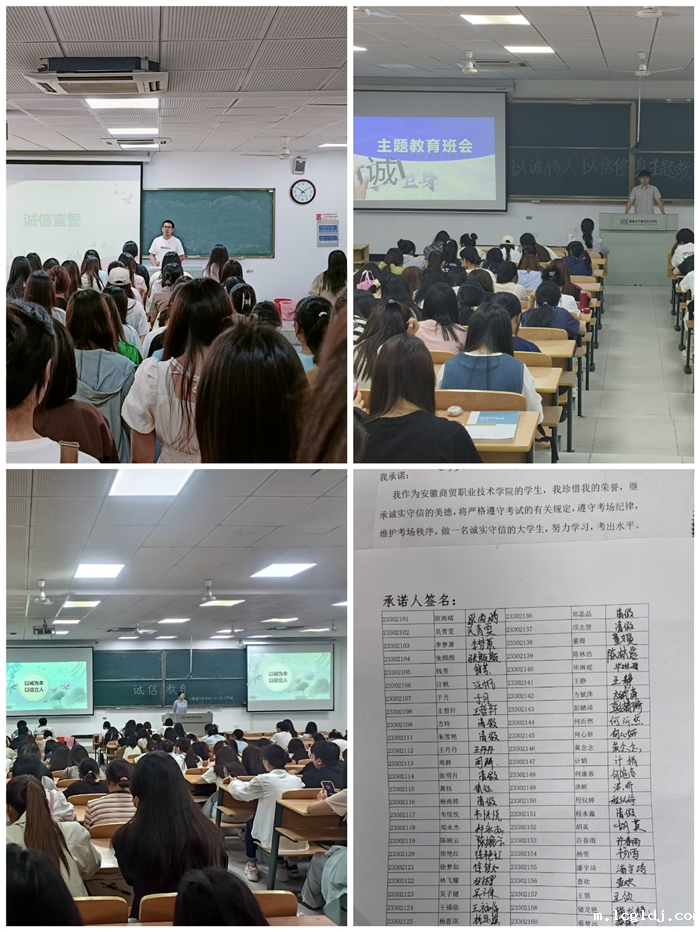 为了深入贯彻社会主义核心价值观,进一步弘扬诚信文化,学院各班级辅导员组织开展诚信主题教育班会。在班会上,辅导员引导学生将诚信融入日常生活中的每一件小事,认识到诚信对于人生的重要意义。同时,辅导员向同学们普及个人征信知识,引导学生珍惜信用,重视个人征信;教育学生在申请贫困生认定、国家助学金等资助项目时,恪守诚信原则;提醒学生理性消费,不要涉及“校园贷”;告诫学生在接下来的期末考试期间要守好诚信原则,并带领学生进行了诚信宣誓。此次班会,让学生们提高了诚信意识、金融意识、风险意识、法律意识和责任意识,推进诚信教育入脑入心,做到言行一致、表里如一,积极将诚信传递给身边的人,共同营造一个诚信、和谐的校园环境。
