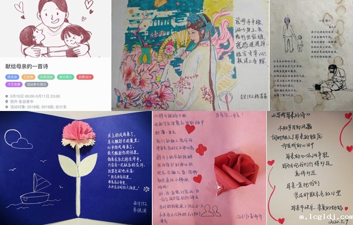 母亲节前夕,会计系团总支通过第二课堂平台,线上发起“献给母亲的一首诗”活动,活动作品要求以感恩母爱为主题,用经典诗歌或原创诗歌表达对母亲的真情实感。各班级学生踊跃报名参与,活动共征集到2018、2019级学生作品300余幅,同学们用绘画、剪纸、染色、拼图等创作方式点缀献给母亲的诗歌,表达对母亲辛勤养育的感恩之情。