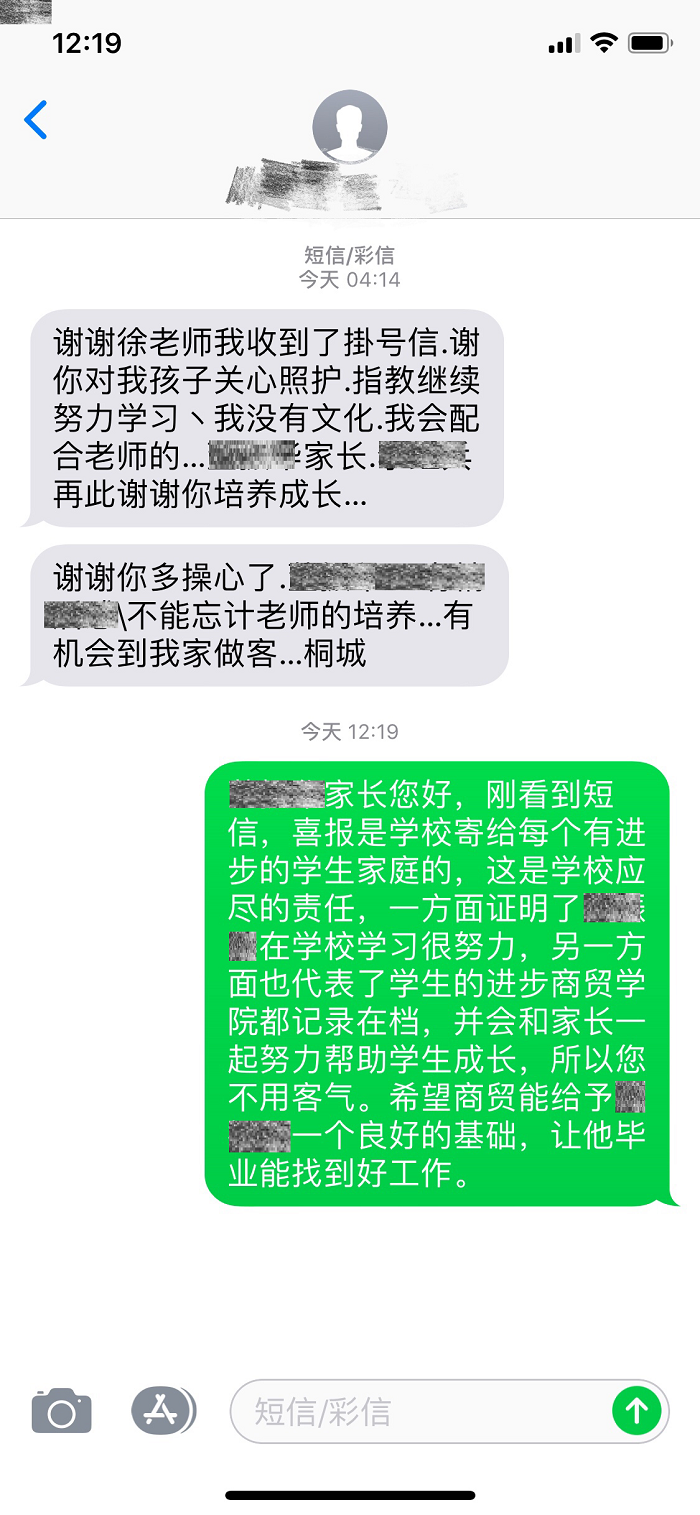 经济贸易系董振华同学的家长发短信给辅导员说:“谢谢老师对孩子的培养和照顾,自己没有什么文化,但是会配合老师做好工作,有时间来家里做客。”