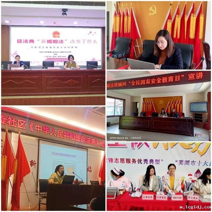 学院文秘专业教师党员利用芜湖市演讲朗诵协会和公众号诵读平台,积极参与普通话推广活动。法律专业教师党员则利用专业优势,除了在校内开展“宪法活动周”等常规性普法活动以外,还经常性地走进社区开展义务法律咨询活动和讲座。特别是针对2020年修订的《中华人民共和国民法典》这一事关民生的具有里程碑意义的法律,各位教师党员们在仔细研读后,深入社区,有计划地开展各种普法活动,有效地宣传了习近平法治思想,响应了习近平总书记在中央政治局第二十次集体学习时的重要讲话精神。
