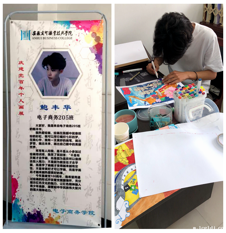 携手共美育,飞扬中国梦。在电子商务学院的走廊里,悬挂的一幅幅精美的绘画作品,吸引着来往师生驻足观看。画面中,党旗、天安门、华表、红船、高铁等元素彰显了鲜明的时代特征,绚丽的画笔描绘了作者眼中的盛世中国,抒发了爱党爱国的深厚情怀,传递了满满的正能量。看到这些流畅的线条,色彩的搭配以及空间的布局,你一定以为是专业的绘画作品,但令人意想不到的是,它们都出自从未参加过培训的普通同学之手,他就是电子商务205班的鲍丰华。