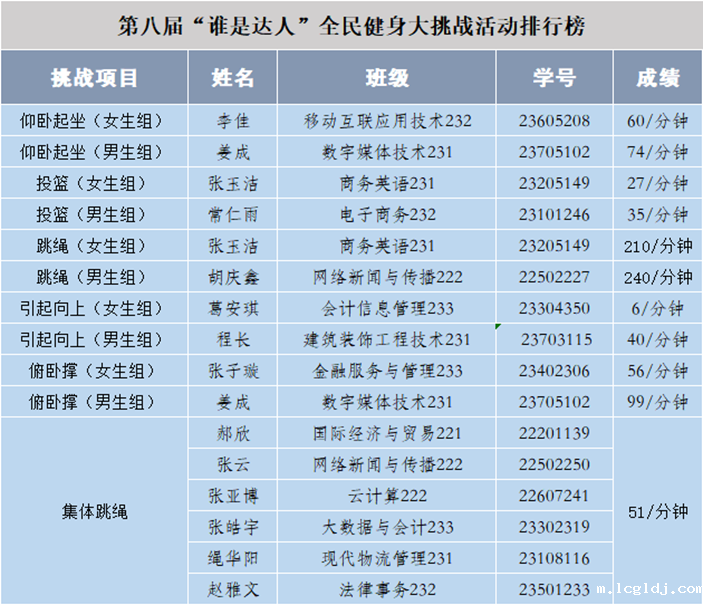 为增强吸引力和参与度,活动设置了跳绳、投篮、仰卧起坐、引体向上等多个项目,同学们“各取所需”,纷纷打卡、尽情展示。活动根据运动的强度设置“达标”和“达人”两个标准,在扩大覆盖面的同时激发潜能,挖掘“达人”。活动现场气氛火热,同学们不放弃、不服输、坚持的精神感染力十足,“达人”们的骄人成绩更是赢得了阵阵掌声与喝彩。经过激烈角逐,商务英语231班张玉洁、现代物流管理231班绳华阳等同学获得运动“达人”称号。