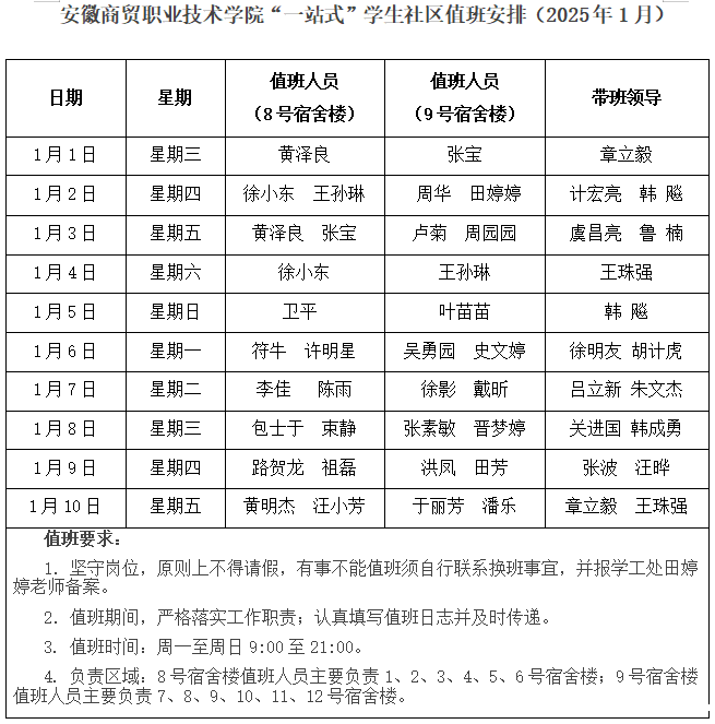 2025年1月“一站式”学生社区值班安排表