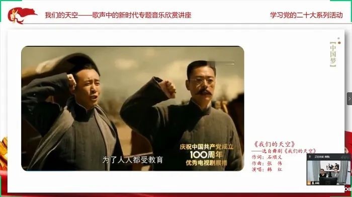 在文化的推陈出新教育环节,主办方线上邀请了中国音乐家协会会员、芜湖市音乐家协会副主席、艺术设计学院党总支书记韩飚和马克思主义学院青年教师章诚携手以《我们的天空——歌声中的新时代》为题,为同学们开展了红歌专题音乐欣赏讲座。两位老师推陈出新地选用了《领航》《我们都是追梦人》等多首脍炙人口的歌曲,将新时代的伟大成就通过一首首动听的歌曲串联起来,带领同学们在歌声中深刻领悟中国梦的伟大内涵,深刻领略脱贫攻坚、抗击疫情等伟大壮举,更让全体学生在优美的歌声中真切体会到了中国共产党心系人民福祉的博大情怀。