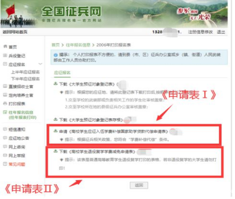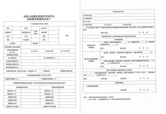 1.应征报名的高校学生登录全国征兵网,按要求在线填写、打印《应征入伍服兵役高等学校学生国家教育资助申请表Ⅰ》(以下简称《申请表Ⅰ》,正反打印,一式两份,和入伍通知书复印件两份)并提交高校学生资助管理部门。在校期间获得国家助学贷款的学生,需同时提供《国家助学贷款借款合同》复印件和本人签字的偿还贷款计划书(见附件)。