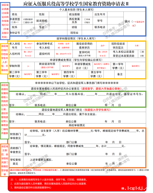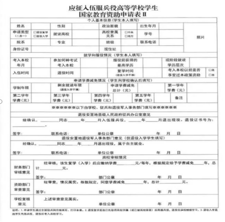 注意事项:退役入学、退役复学学生必须在“全国征兵网”上登记报名,在线填写并打印《应征入伍服兵役高等学校学生国家教育资助申请表Ⅱ》。照片部分需一寸证件照,加盖相应单位鲜章。