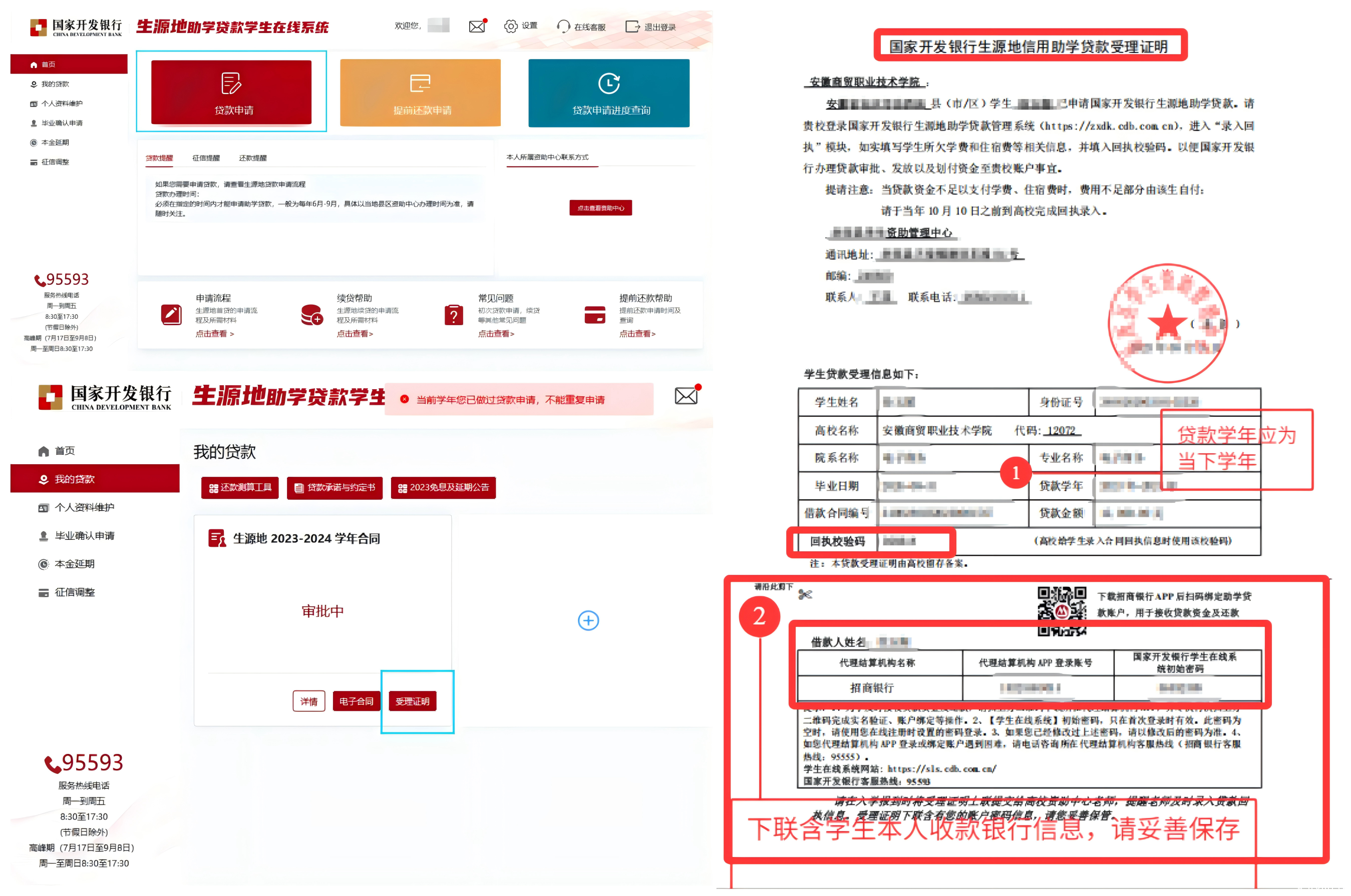 3.请注意区分贷款机构养成定期登录系统的习惯,保存好登录密码。登录在线系统,下载、截图或打印当年贷款回执单(用款回执/受理证明上有6位贷款回执码),通过今日校园APP(新生通过【绿色通道】模块,老生通过【辅导猫】)录入贷款回执信息(登记6位贷款回执码,上传贷款回执图片),后续由学校学生资助管理中心统一录入电子回执,完成学校审批。因学生未提交当年贷款回执码,导致高校未按时录入回执的,视同借款学生撤销当年生源地信用助学贷款申请。