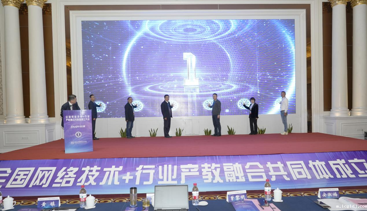 聂伟、黄镇、周勇、曾黎明、安淑梅、吴伟成共同按下启动按钮,宣布全国网络技术+行业产教融合共同体正式启动。