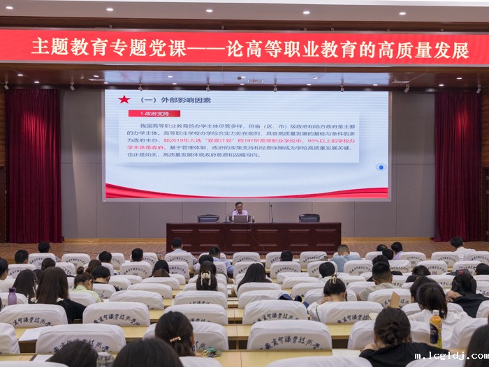 为深入学习贯彻党的二十大提出的“高质量发展是全面建设社会主义现代化国家的首要任务”的讲话精神,牢牢抓住教育发展的核心主线。6月14日下午,校党委委员、副院长郑承志结合当前形势,立足本校实际,以“论高等职业教育高质量发展”为主题给行政第二党总支、会计学院党总支和文化与法律学院党总支全体党员上主题教育专题党课。